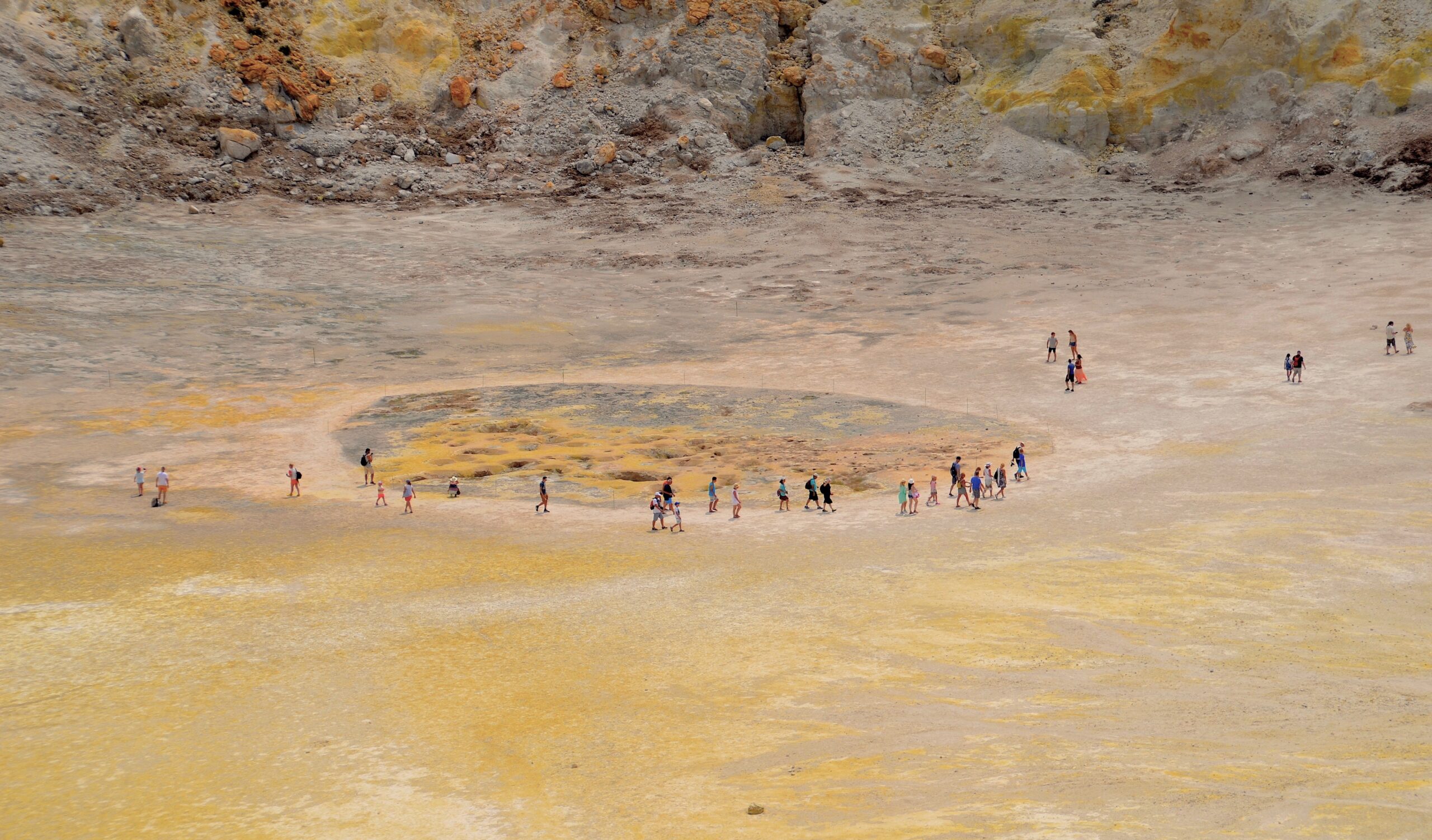 Οσο περισσότερο πλησιάζεις, τόσο η μυρωδιά από το θειάφι κυριαρχεί στον αέρα, γεμίζοντας τη μύτη και τα πνευμόνια σου. Καθώς διασχίζεις την πεδινή λεκάνη του Λακκίου και ανηφορίζεις προς τα ψηλότερα σημεία της καλντέρας, φτάνεις πάνω από τον επισκέψιμο κρατήρα Στέφανο και αντικρίζεις ένα μοναδικό θέαμα: το λευκό χρώμα του εδάφους αναμειγνύεται με λεμονί και φαιές αποχρώσεις, γεμίζοντας την παλέτα του τοπίου με ρωγμές, τρύπες και αχνό ατμό που ξεφεύγει από τις ρωγμές της γης. Οι πολύχρωμες φιγούρες των ανθρώπων που κυκλοφορούν επάνω στο καυτό έδαφος, φωτογραφίζοντας και τραβώντας βίντεο, μοιάζουν τοποθετημένες εκεί από έναν επιδέξιο διευθυντή φωτογραφίας. Κατηφορίζεις την πλαγιά -τα τοιχώματα του κρατήρα-, μαζί με τα γκρουπ των τουριστών, ξέροντας ότι σε λίγο θα γίνεις κι εσύ μια από αυτές τις φιγούρες και θα περιηγηθείς έκπληκτος μέσα στο απόκοσμο σκηνικό.