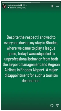 “Παρά τον σεβασμό που έδειξα σε όλους κατά τη διάρκεια της παραμονής μου στη Ρόδιο, όπου βρεθήκαμε για να παίξουμε ένα παιχνίδι πρωταθλήματος, σήμερα βίωσα αντιεπαγγελματική συμπεριφορά τόσο από τη διοίκηση του αεροδρομίου, όσο και από την Aegean Airlines στο αεροδρόμιο της Ρόδου. Τεράστια απογοήτευση για έναν τόσο τουριστικό προορισμό”.