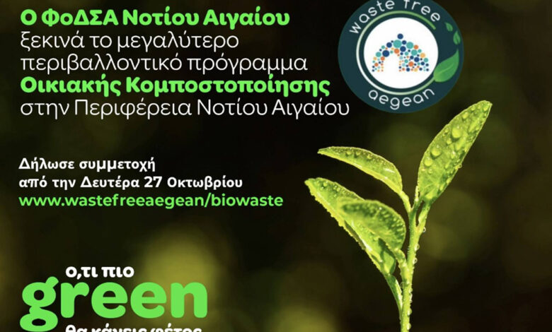 Ό,τι πιο green θα κάνεις φέτος ξεκινά την Δευτέρα 27 Οκτωβρίου 2025, στις 09:00, όπου οι πολίτες της Περιφέρειας Νοτίου Αιγαίου μπορούν να δηλώσουν συμμετοχή στο μεγαλύτερο πρόγραμμα οικιακής κομποστοποίησης και να διεκδικήσουν την απόκτηση του δικού τους οικιακού κομποστοποιητή εντελώς δωρεάν.