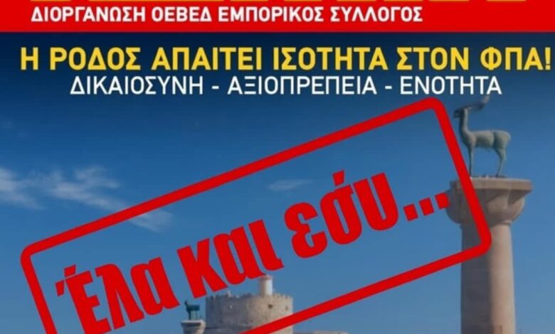 Το Εργατικό Κέντρο Ρόδου εκφράζει την πλήρη στήριξη του στην κινητοποίηση για την επαναφορά των μειωμένων συντελεστών ΦΠΑ
