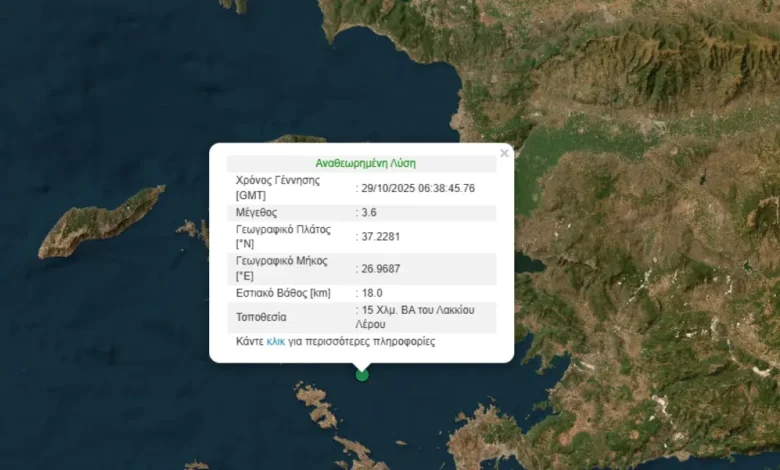 Σεισμική δόνηση μεγέθους 3,6 βαθμών της Κλίμακας Ρίχτερ σημειώθηκε στις 8:38 το πρωί της Τετάρτης ανοιχτά της Λέρου.