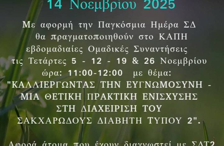 Το ΚΑΠΗ Δήμου Ρόδου, στο πλαίσιο της προαγωγής της ψυχικής υγείας και της υποστήριξης ατόμων με χρόνια νοσήματα, υλοποιεί τη νέα ψυχοεκπαιδευτική παρέμβαση με τίτλο «Καλλιέργεια Ευγνωμοσύνης: Μια θετική πρακτική αυτοδιαχείρισης σε ασθενείς με Σακχαρώδη Διαβήτη».