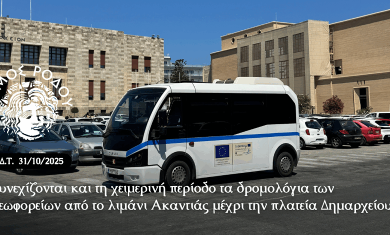 Από τη Διεύθυνση Συγκοινωνίας Δήμου Ρόδου ανακοινώνεται ότι τα δρομολόγια των λεωφορείων από το λιμάνι Ακαντιάς μέχρι την πλατεία Δημαρχείου και αντίστροφα θα συνεχιστούν και τη χειμερινή περίοδο και θα τεθούν σε ισχύ από τη Δευτέρα 3 Νοεμβρίου.