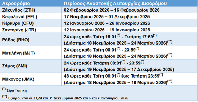 Συγκεκριμένα, οι ημερομηνίες για την αναστολή λειτουργίας των διαδρόμων, ανά αεροδρόμιο, παρουσιάζονται στον παρακάτω Πίνακα: