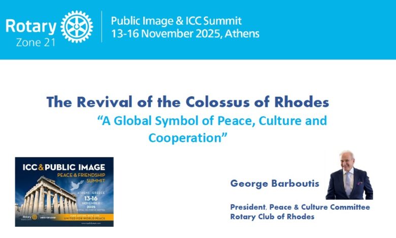 Η Αθήνα φιλοξένησε μια παρουσίαση που επαναφέρει τη Ρόδο στο επίκεντρο της διεθνούς συζήτησης για τα σύμβολα ειρήνης και πολιτισμού. Ο ομιλητής κ. Γιώργος Μπαρμπούτης, πρόεδρος της Επιτροπής Ειρήνης και Πολιτισμού του Ροταριανού Ομίλου Ρόδου, παρουσίασε το σχέδιο «The Revival of the Colossus of Rhodes», ένα όραμα που μεταφράζει την ιστορική μνήμη σε σύγχρονη υποδομή διαλόγου και συνεργασίας.
