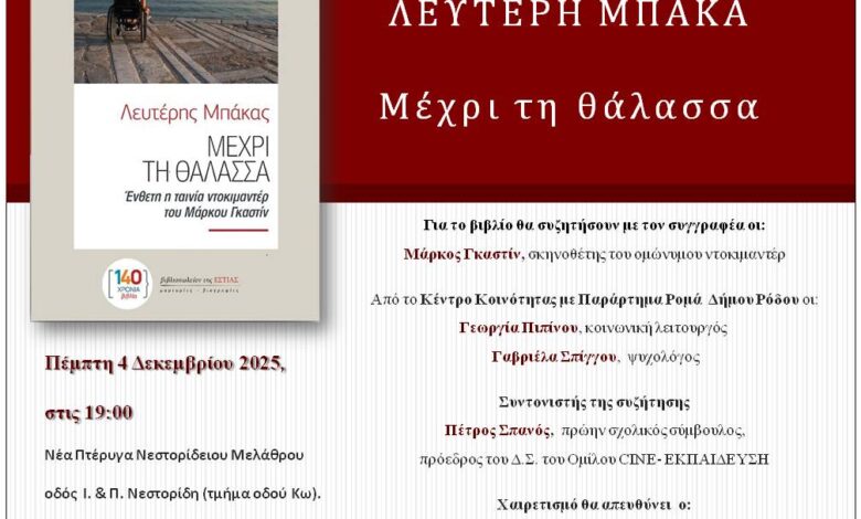 Την Πέμπτη 4 Δεκεμβρίου 2025, στις 19:00, στη Νέα Πτέρυγα Νεστορίδειου Μελάθρου, θα παρουσιαστεί το βιβλίο του Λευτέρη Μπάκα “Μέχρι τη Θάλασσα”, μια συγκλονιστική κατάθεση ψυχής που συνοδεύει την ομώνυμη ταινία-ντοκιμαντέρ του σκηνοθέτη Μάρκου Γκαστίν. Ένα έργο βαθιά ανθρώπινο, που αναδεικνύει τις προκλήσεις, τα όνειρα και την ελευθερία μέσα από το ταξίδι ενός ανθρώπου με αναπηρία μέχρι την ακροθαλασσιά της δικής του δύναμης, όπως ομολογεί ο ήρωας: «Η αναπηρία δεν με εμπόδισε να ονειρεύομαι. Με ανάγκασε απλώς να ονειρεύομαι πιο γενναία».