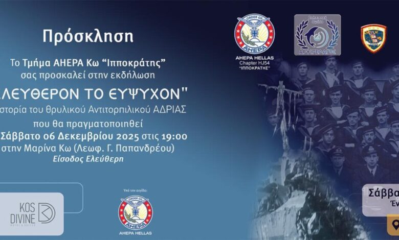 η Ιστορία του Αντιτορπιλικού ΑΔΡΙΑΣ, το Σάββατο στις 6 Δεκεμβρίου 2025 και ώρα έναρξης 19.00, στη Μαρίνα Κω (Λεωφ. Γ. Παπανδρέου)