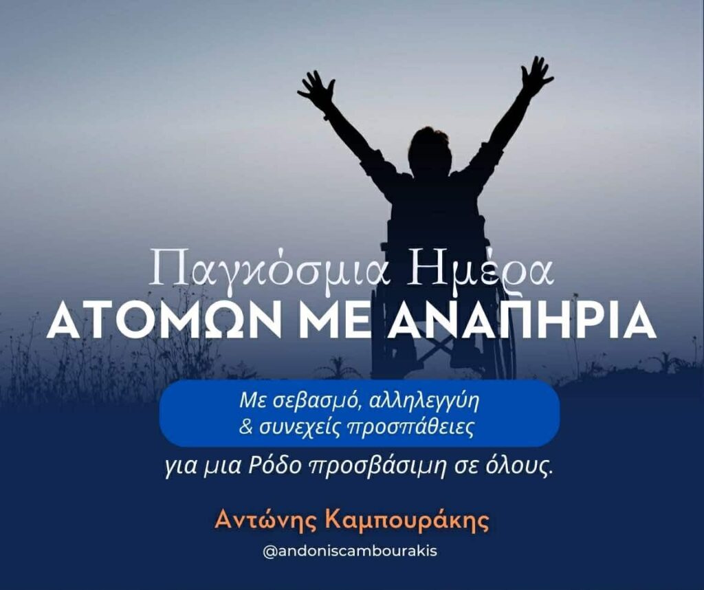 Ως Ροδίτες έχουμε χτίσει μια σημαντική βάση στήριξης, μέσα από δομές και υπηρεσίες, που αγκαλιάζουν άτομα με αναπηρία, και τις οικογένειές τους. Αυτή η πορεία πρέπει να συνεχιστεί και να ενισχυθεί! Ώστε κάθε πολίτης, να έχει τη δυνατότητα να ζει, να κινείται και να συμμετέχει χωρίς εμπόδια. Γιατί, η προσβασιμότητα δεν είναι χάρη, ούτε προνόμιο. Είναι δικαίωμα, που οφείλουμε να διασφαλίζουμε, ως κοινωνία πολιτισμού και πραγματικής αλληλεγγύης.