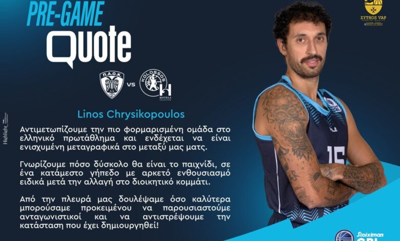 Την άποψή του για την εκτός έδρας αναμέτρηση του Κολοσσού απέναντι στον ΠΑΟΚ (6/12, 16:00), για την 9η αγωνιστική της GBL μοιράστηκε ο Λίνος Χρυσικόπουλος. Όσα ανέφερε ο Έλληνας αθλητής: ”Αντιμετωπίζουμε την πιο φορμαρισμένη ομάδα στο ελληνικό πρωτάθλημα και ενδέχεται να είναι ενισχυμένη μεταγραφικά στο μεταξύ μας ματς. Γνωρίζουμε πόσο δύσκολο θα είναι το παιχνίδι, σε ένα κατάμεστο γήπεδο με αρκετό ενθουσιασμό ειδικά μετά την αλλαγή στο διοικητικό κομμάτι. Από την πλευρά μας δουλέψαμε όσο καλύτερα μπορούσαμε προκειμένου να παρουσιαστούμε ανταγωνιστικοί και να αντιστρέψουμε την κατάσταση που έχει δημιουργηθεί”.