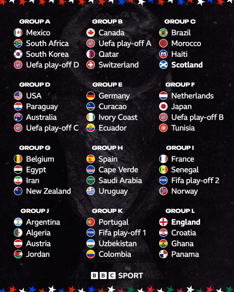 1ος όμιλος: Μεξικό, Νότια Αφρική, Nότια Κορέα, Ευρωπαϊκά playoffs (Δανία, Βόρεια Μακεδονία, Τσεχική Δημοκρατία ή Ιρλανδία)
