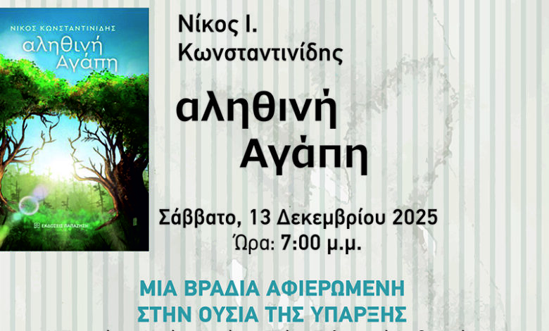 Λόγω των πρόσφατων καιρικών συνθηκών, η παρουσίαση του νέου μυθιστορήματος του Νίκου Ι. Κωνσταντινίδη, «αληθινή Αγάπη», επαναπρογραμματίζεται για το Σάββατο 13 Δεκεμβρίου 2025, στις 6:30 μ.μ., στον εμβληματικό χώρο της Νέας Πτέρυγας του Νεστορίδειου Μελάθρου στη Ρόδο.