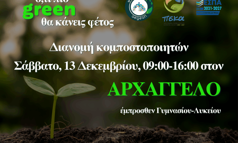 Το Σάββατο 13 Δεκεμβρίου 2025, από τις 09:00 έως τις 16:00, θα πραγματοποιηθεί διανομή κομποστοποιητών στον Αρχάγγελο Ρόδου, μπροστά από το Γυμνάσιο–Λύκειο. Τα επόμενα Σάββατα θα ακολουθήσουν και άλλοι οικισμοί της Ρόδου, με το πρόγραμμα να δημοσιοποιείται κάθε εβδομάδα.