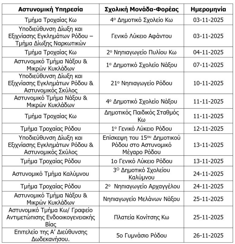 Κατά τον μήνα Νοέμβριο 2025 καταρτισμένοι Αξιωματικοί και στελέχη Αστυνομικών Υπηρεσιών σε Σύρο, Μύκονο, Ρόδο και Κω, πραγματοποίησαν -15- ενημερωτικές διαλέξεις τις οποίες παρακολούθησαν -1.183- νήπια, μαθητές, εκπαιδευτικοί και πολίτες.