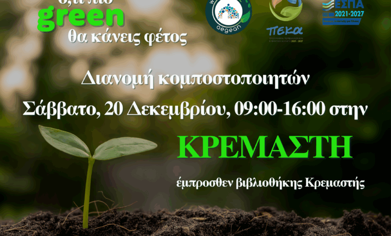 Το Σάββατο 20 Δεκεμβρίου 2025, από τις 09:00 έως τις 16:00, η Κρεμαστή γίνεται σημείο αναφοράς για την κομποστοποίηση, με τη διανομή κομποστοποιητών μπροστά από τη Βιβλιοθήκη Κρεμαστής, δίπλα στο Πολιτιστικό Κέντρο, στην καρδιά της Κρεμαστής.