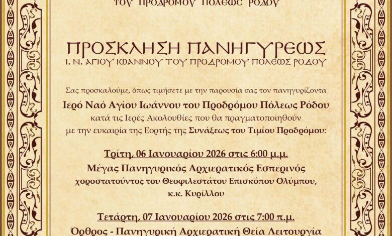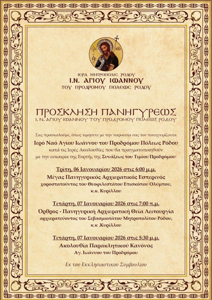 Το πρόγραμμα του εορτασμού του Αγίου Ιωάννη του Προδρόμου πόλεως Ρόδου