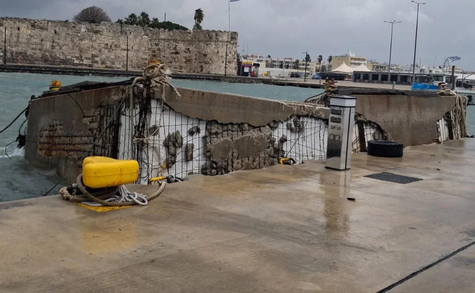 Όπως μεταδίδει το vimatisko, οι δυνατοί άνεμοι είχαν ως αποτέλεσμα να σπάσουν τα μπλόκια στο λιμάνι της Κω (πλωτές κατασκευές που επιπλέουν και χρησιμοποιούνται για την προστασία του λιμανιού), αλλά και να πέσουν κολώνες φωτισμού.