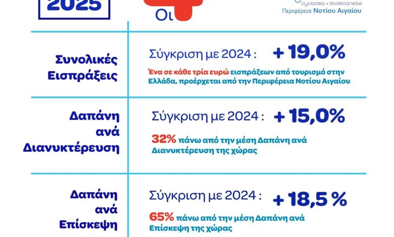 Οι συνολικές τουριστικές εισπράξεις αυξήθηκαν κατά 19% σε σχέση με τη αντίστοιχη περίοδο του 2024, ξεπερνώντας τα 6 δις ευρώ (€6.057,3). Ως αποτέλεσμα αυτού, το Νότιο Αιγαίο κατατάσσεται πρώτο μεταξύ των 13 περιφερειών της χώρας, συγκεντρώνοντας το 32% των συνολικών τουριστικών εισπράξεων της χώρας. Πολύ απλά, για κάθε 3 ευρώ εισπράξεων από τον τουρισμό στην Ελλάδα, ένα ευρώ προέρχεται από το Νότιο Αιγαίο.