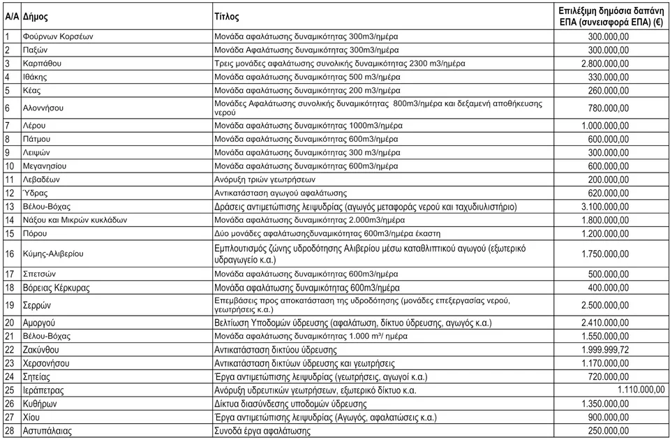 Το ποσό δεσμεύθηκε από το Τομεακό Πρόγραμμα Ανάπτυξης 2025 του υπουργείου Περιβάλλοντος και Ενέργειας και αφορά, μεταξύ άλλων, τη δημιουργία και τον εκσυγχρονισμό μονάδων αφαλάτωσης, τη βελτίωση και αντικατάσταση δικτύων ύδρευσης, δράσεις αξιοποίησης πηγαίων νερών (αγωγοί, ταχυδιυλιστήρια) κ.ά.