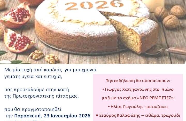 Το ΚΑΠΗ Δήμου Ρόδου, θα πραγματοποιήσει την κοπή της Πρωτοχρονιάτικης του πίτας την Παρασκευή 23 Ιανουαρίου 2026 ώρα 11 το πρωί, στον χώρο του, στην οδό Αγίου Ιωάννου 54, παρουσία του Σεβασμιότατου Μητροπολίτη Ρόδου κ.κ. Κυρίλλου και της αντιδημάρχου Κοινωνικής Πολιτικής, Αλληλεγγύης, Ισότητας και Προσχολικής Αγωγής Σαββίνας Παπαγεωργίου.