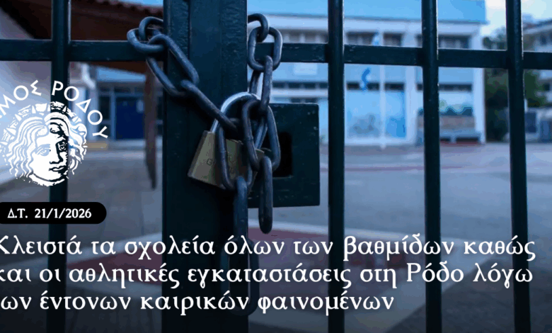 Με απόφαση του Δημάρχου Ρόδου, Αλέξανδρου Κολιάδη, οι σχολικές μονάδες όλων των βαθμίδων στο νησί θα παραμείνουν κλειστές από σήμερα Τετάρτη 21 Ιανουαρίου έως και την Πέμπτη 22 Ιανουαρίου 2026.