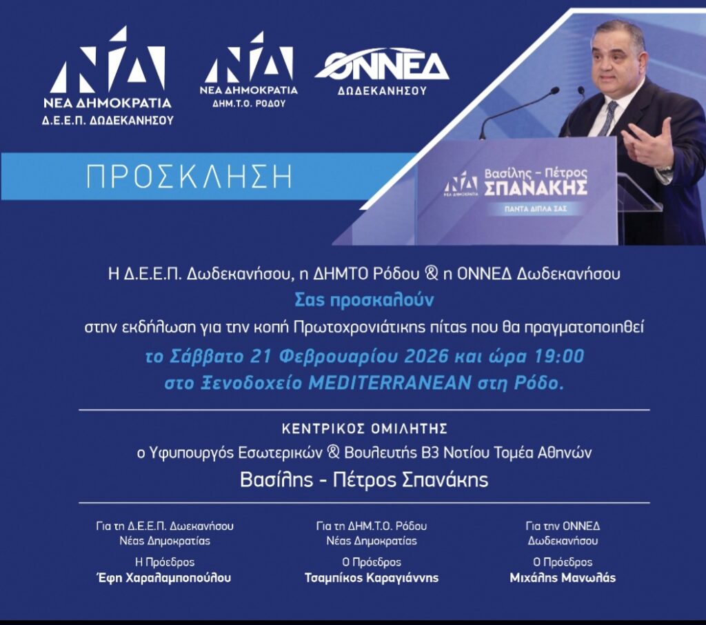 Το Σάββατο 21 Φεβρουαρίου και ώρα 19:00 στο ξενοδοχείο Mediterranean θα πραγματοποιηθεί η κοπή της πίτας της Ν.Δ με κεντρικό ομιλητή τον Υφυπουργό Εσωτερικών Βασίλη Σπανάκη.