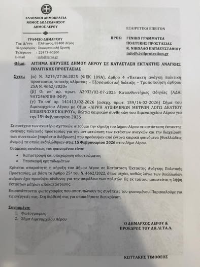 Ο Δήμαρχος Λέρου, Τιμόθεος Κωττάκης, απέστειλε επίσημη επιστολή προς τον Γενικό Γραμματέα Πολιτικής Προστασίας, Νίκο Παπαευσταθίου, ζητώντας την άμεση κήρυξη του νησιού σε κατάσταση έκτακτης ανάγκης, προκειμένου να επιταχυνθούν οι διαδικασίες αποκατάστασης των ζημιών.