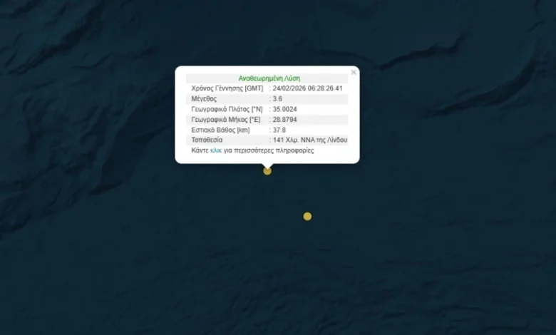 Σεισμός μεγέθους 3,6 βαθμών της κλίμακας Ρίχτερ σημειώθηκε το πρωί της Τρίτης, 24 Φεβρουαρίου, στη Ρόδο.
