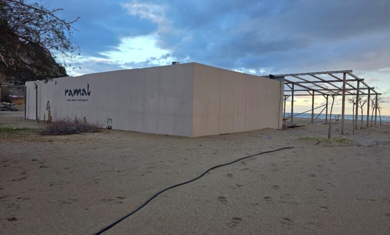 – Στην παραλία Sunwing, το Beach-Bar KALAMI εξακολουθεί να καταλαμβάνει παράνομα δημόσιο χώρο με μόνιμη αυθαίρετη κατασκευή.