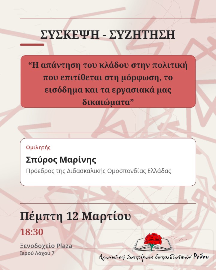 Στο πλαίσιο αυτό, η Αγωνιστική Συσπείρωση Εκπαιδευτικών Ρόδου διοργανώνει την Πέμπτη 12 Μαρτίου, στις 18:30, στο ξενοδοχείο Plaza, σύσκεψη-συζήτηση με θέμα: «Η απάντηση του κλάδου στην πολιτική που επιτίθεται στη μόρφωση, το εισόδημα και τα εργασιακά μας δικαιώματα», με ομιλητή τον Σπύρο Μαρίνη.