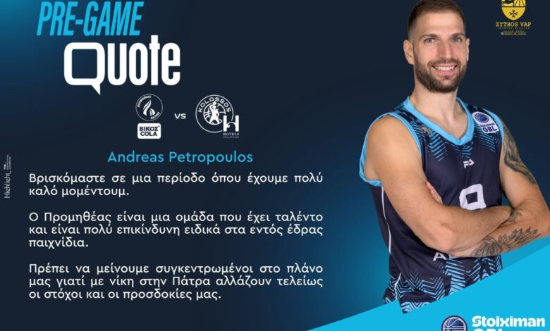 «Βρισκόμαστε σε μια περίοδο όπου έχουμε πολύ καλό μομεντουμ. Ο Προμηθέας είναι μια ομάδα που έχει ταλέντο και είναι πολύ επικίνδυνη ειδικά στα εντός έδρας παιχνίδια. Πρέπει να μείνουμε συγκεντρωμένοι στο πλάνο μας γιατί με νίκη στην Πάτρα αλλάζουν τελείως οι στόχοι και οι προσδοκίες μας.»