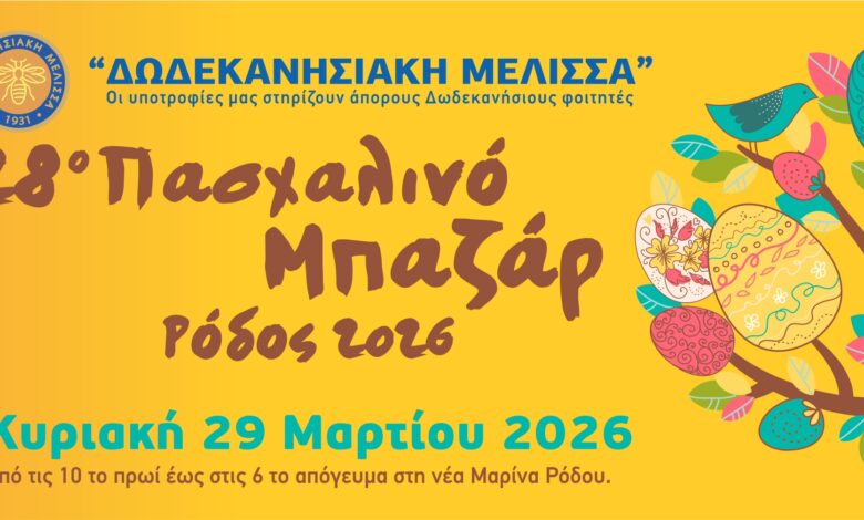 Η Δωδεκανησιακή Μέλισσα – Επιτροπή Ρόδου, διοργανώνει το 28ο Πασχαλινό Μπαζάρ της, την Κυριακή 29 Μαρτίου 2026, στη Νέα Μαρίνα της Ρόδου για τη στήριξη και χορήγηση υποτροφιών σε οικονομικά αδύναμους Δωδεκανήσιους φοιτητές. Ώρες: 10.00-18.00.