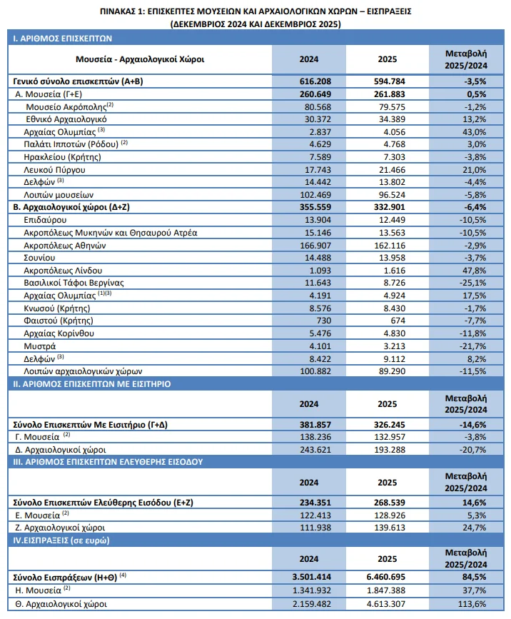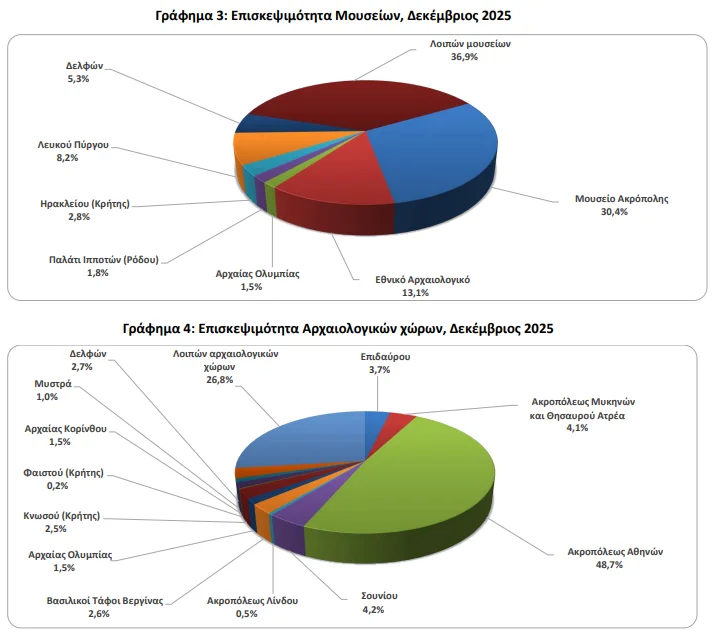 Επίσης, σύμφωνα με την ΕΛΣΤΑΤ, στους αρχαιολογικούς χώρους τον Δεκέμβριο 2025, σε σύγκριση με τον αντίστοιχο μήνα του 2024, καταγράφεται μείωση των επισκεπτών κατά 6,4%, αύξηση των